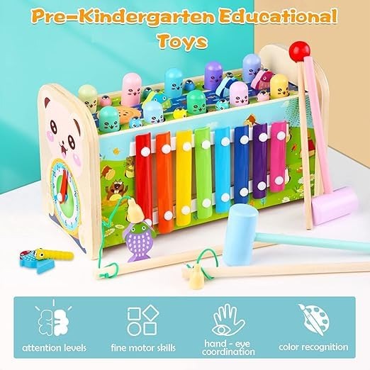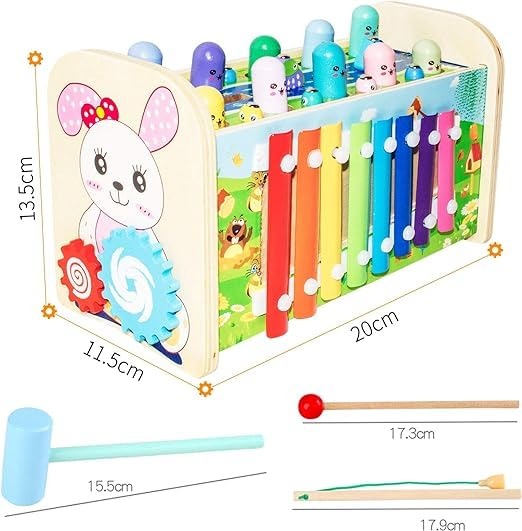 The Multi-purpose Ground Mouse is a versatile 7-in-1 wooden educational toy designed for children aged 3 years and above. It combines multiple fun activities in one set, such as hammering, fishing, music play, shape sorting, and learning time, making it an all-in-one interactive toy. This engaging playset helps children develop fine motor skills, hand-eye coordination, and cognitive abilities while providing endless hours of entertainment.